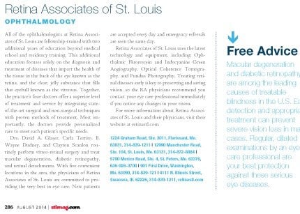 The Physicians of Retina Associates of St. Louis were featured as Top Docs in St. Louis Magazines health issue in 2011, 2012, 2013, 2014, 2015, 2016 and 2017.